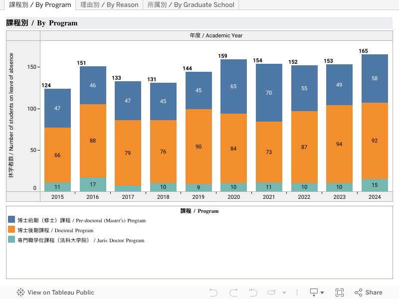 The number of students taking leave of absence from graduate school was constantly around 100 students until AY2014 but has shown a tendency to increase since AY2015. It is difficult to derive any conclusions regarding the reasons for taking leave of absence, as “personal reasons” and “other” collectively account for 50% every year. No significant differences can be observed among graduate programs, but Doctoral degree candidates have a higher tendency to take leave of absence.
