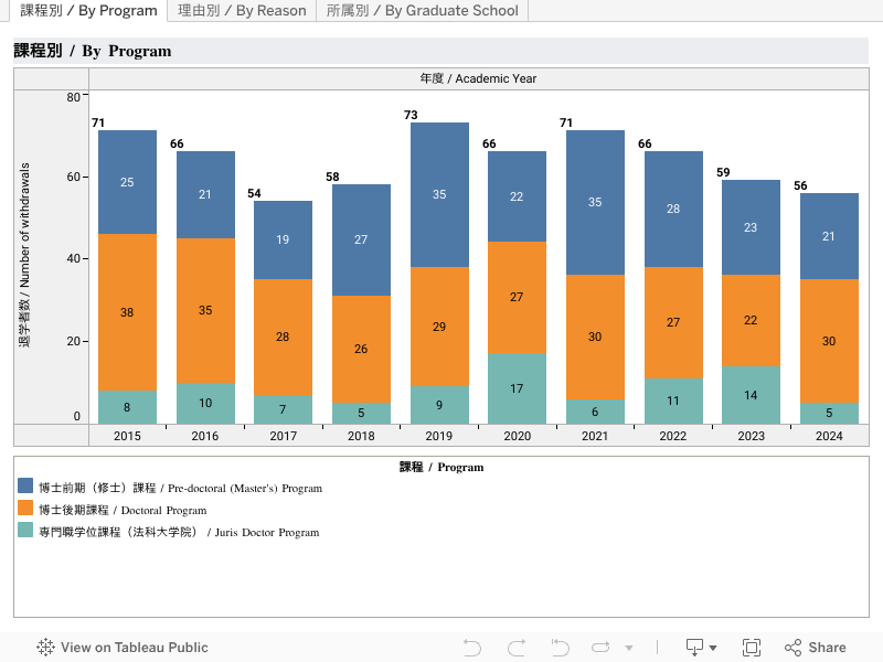 No constant trends are observed in the number of withdrawals from graduate school (including withdrawal by completion). It is difficult to identify any trends as the total is a small number and no significant differences can be observed among Graduate Schools. The main reason for withdrawal is “employment,” which accounts for a large share every year compared to undergraduate students.