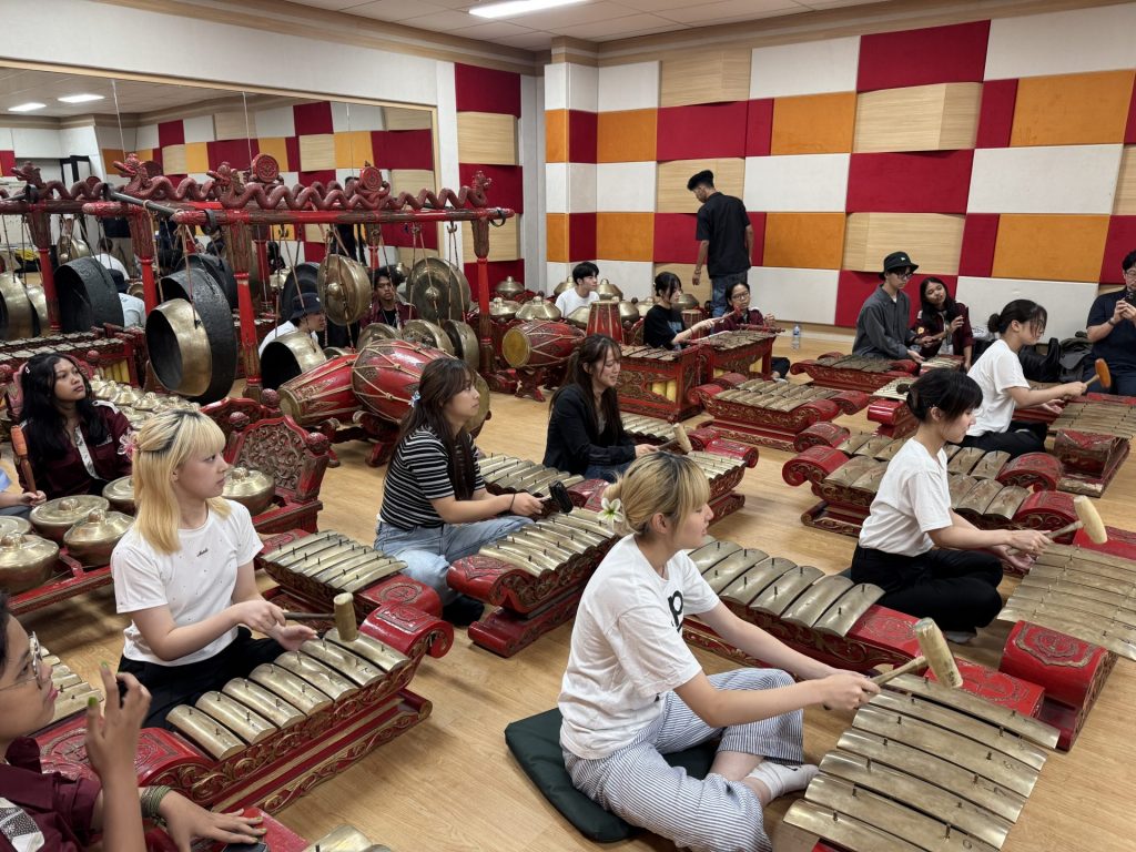 また、語学を学ぶだけでなく、インドネシア文化を体験する機会として様々なセミナーが実施され、バティック*工房での染色体験、ガムラン*講師の指導の下での学生全員でのガムラン演奏体験、ジャムウ*の調合・試飲を体験しました。