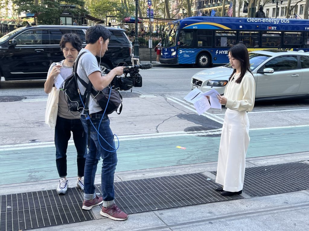 ニューヨークではタイムズスクエアにて、オープニングの映像撮影からスタート。その後、ウオールストリートにあるフェデラルホール、ニューヨーク連邦銀行、国連などを訪問し各地で取材を行いました。また、ブロードウエイミュージカル「ハミルトン」を鑑賞し、アメリカ独立史に欠かせない重要人物、ハミルトンについて理解を深める貴重な機会となりました。また、テレビ東京の生中継を見学した際には、緊迫した報道の現場を目の当たりにしました。