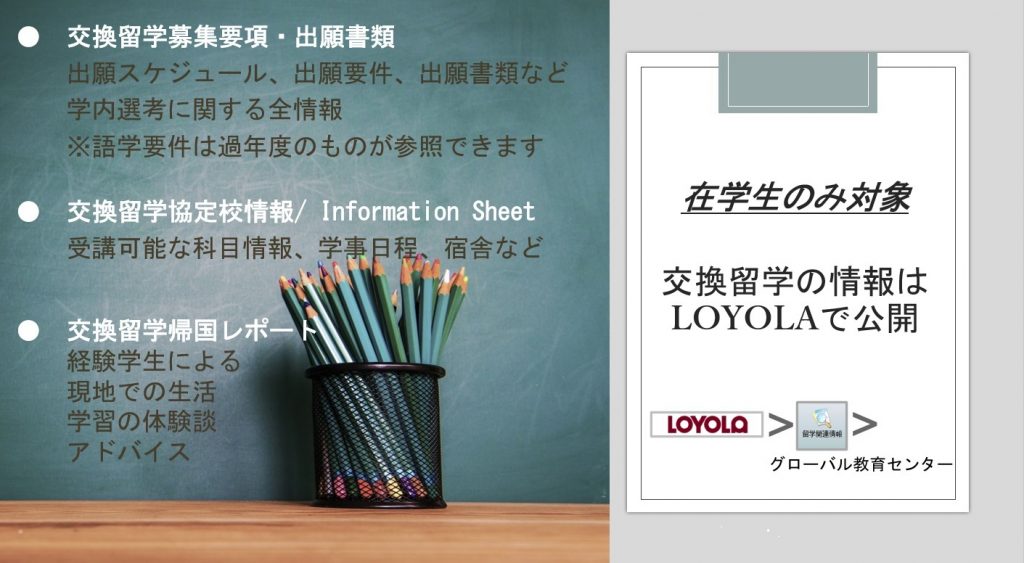 交換留学生の募集は年2回、留学先大学の教授言語と地域毎に行われます。具体的な募集時期や出願要項については、その都度My SophiaおよびLoyola(留学関連情報)でお知らせします。出願方法や要件、単位換算等については、留学ハンドブックを参照してください。