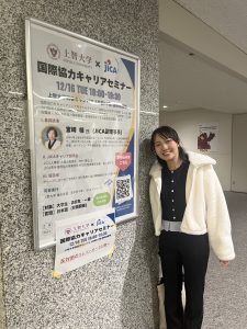 私が企画したイベントは、上智⼤学側にも温かなご協⼒を賜り、JICA 副理事⻑の基調講演を含むキャリアセミナーに当⽇対⾯で約 60⼈、新卒で JICA 海外協⼒隊を経験された⽅と⼀緒に出演した、⼤学⽣に向けたオンライン(ライブ(以下 URL 参照)には当⽇最⼤約 50⼈にご覧いただきました。